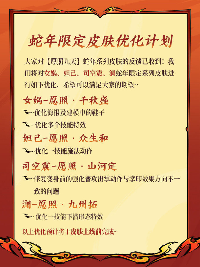 针对于蛇年限定皮肤的优化,预计于皮肤上线前完成。另外不知道大家发现没有,6款年限皮肤中只有蔡文姬和虞姬的皮肤没有优化需要,可见这两款皮肤是相当令人满意了。