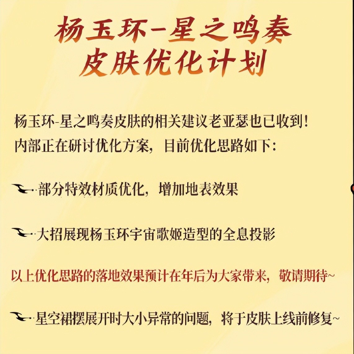 需要注意的是,以上优化思路的落地效果预计年后上线,皮肤上线前将会修复杨玉环星空裙摆展开时大小异常的问题。